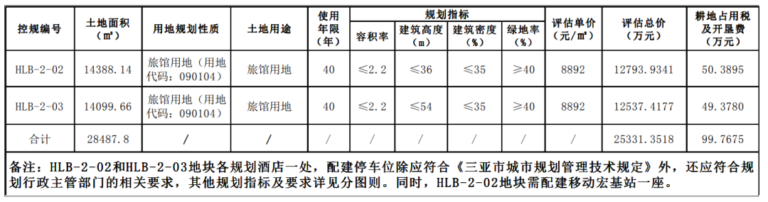 本次挂牌出让宗地位于三亚市中心城区海罗片区控规HLB-2-02和HLB-2-03地块,面积28487.80平方米,用地四至及界址坐标详见地块勘测定界图。其中:1.控规HLB-2-02地块面积为14388.14平方米;2.控规HLB-2-03地块面积为14099.66平方米。经核查2022年10月14日经自然资源部批复的《三亚市国土空间总体规划(2021-2035)》“三区三线”划定成果,该宗地位于城镇开发边界(城镇集中建设区)内,不涉及占用永久基本农田和生态保护红线。同时,经核查《三亚市中心城区海罗片区控制性详细规划(修编)》,控规HLB-2-02和HLB-2-03地块规划用地性质为旅馆用地(用地代码:090104),对应土地用途均为旅馆用地。